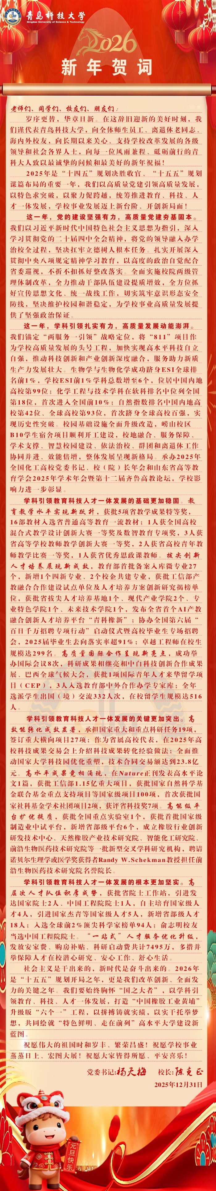 青岛科技大学国家大学科技园,作为学校科技成果转化的主阵地与创新创业的孵化器,深度融合科技与产业,为学校高质量发展注入了强劲动能。过去一年,我们全面推动国家大学科技园优化重塑,技术合同交易额突破23.8亿元,累计孵化服务科技型企业已超300家,交出了一份产教融合的优异答卷。展望新岁,愿科技园持续发挥桥梁纽带作用,加速孵化“从0到1”的原创成果,壮大“专精特新”与“瞪羚”企业集群,打造服务国家战略、赋能社会发展的亮丽名片。值此新元肇启,恭祝科技园蓬勃发展、再谱新篇;祝愿学校宏图大展、日新月异;祝福全体师生、校友及入园企业同仁新年安康、顺遂如意、携手共进、合作共赢!